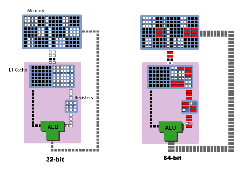 - در برخی از امور، پردازنده مجبور است به طور مدارم مقادیر مورد نظر خود را از حافظه خوانده و رجیستر کند، به همین دلیل شاید انجام یک کار مشخص در پردازنده ۳۲ بیتی به چند سیکل در CPU نیاز داشته باشد، اما همان تسک در یک پردازنده ۶۴ بیتی به دلیل دسترسی وسیعتر به حافظه در سیکلهای کمتری انجام شود. در واقع پردازندههای ۶۴ بیتی قادر هستند تا آدرس دهی وسیعتری را در حافظه داشته باشند و با حجم به مراتب بالاتری از اطلاعات در اپلیکیشنها کار کنند. این موضوع در نرمافزارهایی همچون ویرایش ویدیو، محاسبات سنگین ریاضی، دیتابیسهای بزرگ و مواردی از این قبیل به خوبی خود را نشان میدهد.